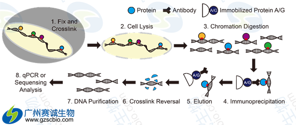 如上圖所示,細胞裂解液里的蛋白和相關(guān)染色質(zhì)暫時結(jié)合;DNA-蛋白復(fù)合物被剪切,與所研究蛋白相關(guān)的DNA片斷被選擇性免疫沉淀;相關(guān)DNA片斷被純化,順序被測定。