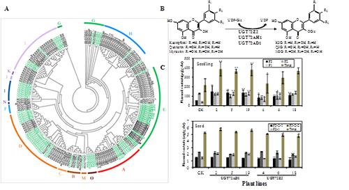 A.百脈根和擬南芥所有UGT蛋白的進(jìn)化關(guān)系分析。B. 三個(gè)UGT重組蛋白以不同黃酮醇為底物的催化反應(yīng)示意圖。C. 過量表達(dá)UGT基因的擬南芥幼苗(上圖)和種子中(下圖)黃酮醇的含量分析